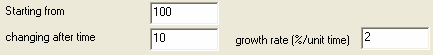 sets exponential growth from the initial value Starting from, remaining constant until changing after time and then growing exponentially at growth rate (%/unit time) for the rest of the simulation. Note that the number 2 means 2%/year (or .02/year) if the model has time in years (independent of the value of TIME STEP).