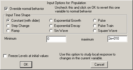 If Override normal behavior is checked, this variable will behave differently from what it otherwise would. The behavior is exogenous or constant as specified by the selected type (this is described below). When the behavior of one or more variables has been overridden the Toolbar changes to: