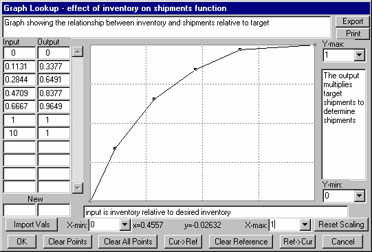 X-min and X-max allow you to control the horizontal scaling. This is useful if you want to focus on a few points or add new points well outside of the old scales. Since lookups can have any interval between x-axis points, it is often desirable to leave off one or both of the end points and concentrate on the middle points. You can click on the down arrow at the right of the values or type in a value and the graph will rescale. The values you set for X-min and X-max will be recorded for your next use of the Lookup Editor, but they do not affect simulation output.