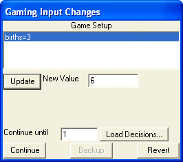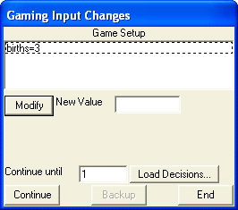 Load Decisions… is used to read in a gaming input file with decisions stored by time. These files can be created by hand or using the Model>Export Gaming menu item. The decisions will be read and the game advanced to the recorded termination time. This is a good way to replicate the results of a gaming session from a small file or for a slightly different model.