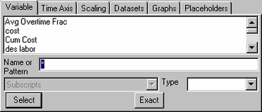 Name or Pattern lets you enter the beginning of names, or wildcard strings using * to match any number of letters and ? to match one letter. For example *labor* finds all variables that include the string labor; *labor finds all variable names ending in labor; and labor* finds all variable names beginning with labor. When you type a name with a wildcard and press Enter or click on select, only names that match the pattern you entered are displayed, and all types of variables are searched.
