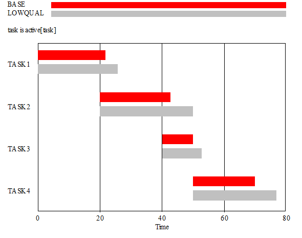 Vensim Professional adds a number of additional tools to be used in the analysis and display of model results. The Gantt chart as shown below