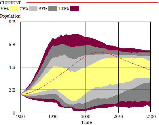 Vensim has a sensitivity capability that makes it easy to run multivariate sensitivity simulations (Monte-Carlo) and Latin Hypercube simulations. Simply select the parameters that you want to test, and the results that you want to see. Vensim's sensitivity graph then will show you either simulation traces or confidence bounds as you choose.