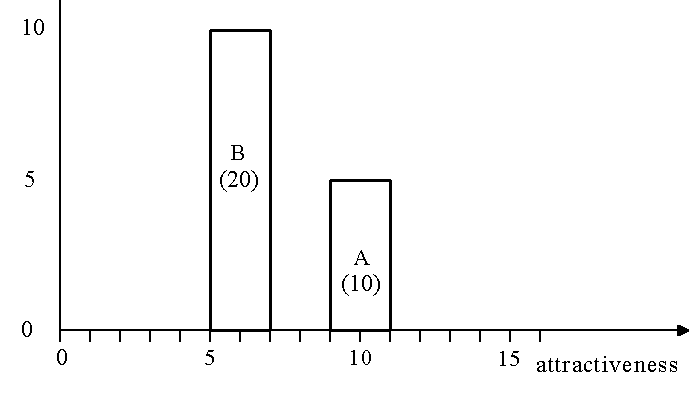 For our first example, we start with rectangles of width 2 attractiveness units. As we said, the height of each supplier’s rectangle is chosen to make the area of the rectangle equal to the capacity of the supplier. Supplier A has capacity of 10, so its rectangle’s height is 10/2, or 5 distribution units per attractiveness unit. Supplier B has a capacity of 20, so its height is 10. The center of each supplier’s rectangle is placed on the X-axis at the attractiveness value of the supplier’s offering: the more attractive suppliers (independent of their supply capacity) are placed to the right. Suppliers A and B have attractivenesses of 10 and 6, respectively, so their rectangles are placed on the attractiveness axis as shown in Figure 1.