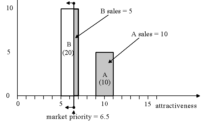 Suppose that suppliers A and B, as shown in Figure 1, are competing for a market of 15 widgets. The Wood algorithm represents the market as a vertical line that moves in from the right, as shown in Figure 2. The market line continues to move until it has swept out an area equal to the total market, and then it stops. In Figure 2, the line has swept out an area of 15 widgets (the shaded region in Figure 2) and has stopped at attractiveness value 6.5. The attractiveness value at which it stops is the “market priority,” or the attractiveness which clears the market. If the capacities of the suppliers are insufficient to cover the market, then each supplier sells all of its capacity.