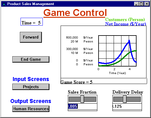 A Vensim application — or Venapp — can be constructed to provide a Management Flight Simulator or Learning Environment for a model.  This allows individuals with little or no training in modeling to get meaningful access to a model.  A Venapp combines a model with customized menu driven screens that you design and build, providing an interface appropriate for your target audience.  Venapp interfaces can display sketches and use view menu commands to manipulate sketches.  Venapp input controls for changing model constants include editing boxes, list boxes, sliders, radio buttons, and checkboxes.