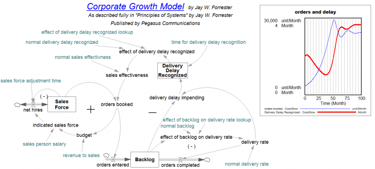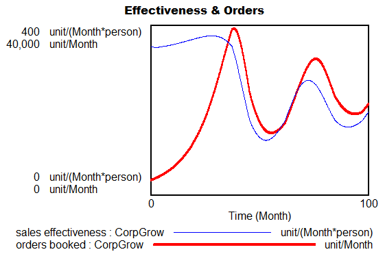 Looking at the causal loop diagram above, we see that the two major feedback loops converge at the variable orders booked, and it is the negative feedback loop through sales effectiveness that creates the major oscillations which are carried over into the positive feedback loop through Sales Force.