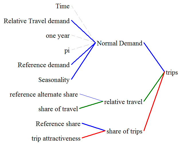 The Tree Diagram analysis tool creates output windows showing a tree of causes branching off the workbench variable. The Causes Tree Diagram shows the causes of a variable; the Uses Tree Diagram shows the uses of a variable. Tree Diagrams show causes and uses up to two variables distant (the default setting). You can continue to trace the causes (or uses) of a variable throughout a model by selecting a new workbench variable to trace (such as net hires in the diagram above) and again clicking on the Causes Tree analysis tool.
