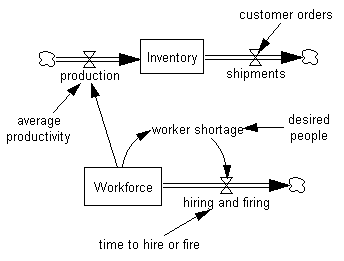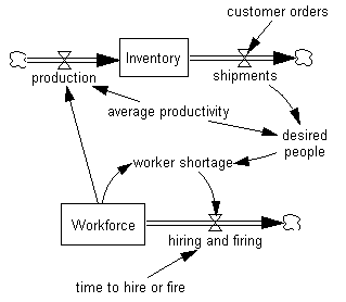 Now as shipments increase, the variable Desired People will also increase, and after a delay, Workforce will increase, raising production and increasing Inventory.