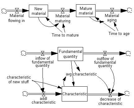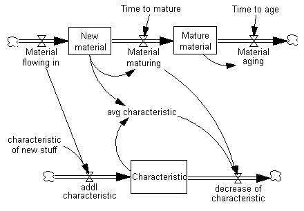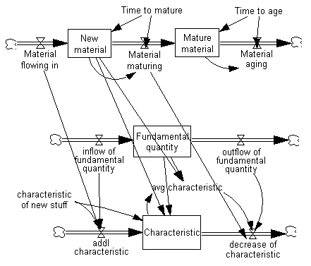 We want to replace the variable Fundamental quantity with the variable New material; and replace the inflow and outflow of fundamental quantity with Material flowing in and Material maturing. In this way, we can build a coflow to determine the average characteristic of the New material.