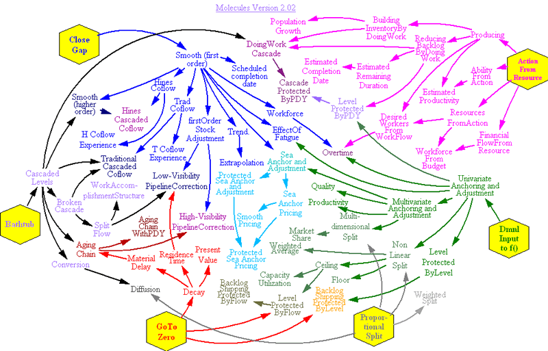 The diagram above is presented when the user selects the Vensim menu item Windows>Molecules. Double clicking on any of the names in the diagram brings up that molecule. The user can then select the molecule (or a portion of it), copy it to the clipboard, and insert it into the model they are working on. Once this is done, the normal Vensim tools are used to rename the model elements, change the units of measurement, and finish construction of the model.